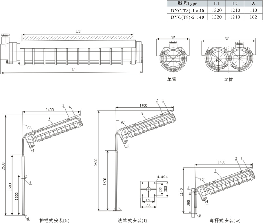 按產(chǎn)品型號說明逐條選擇,例:需要T8節(jié)能燈管2X40W,護(hù)欄式安裝,則產(chǎn)品型號為DYC(T8)-2×40h;